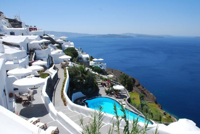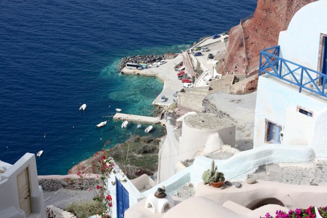 费拉市码头附近有许多悬崖,无数的白色小屋依山而建。从码头只有一条“Z”形的小路延伸至高地上的市中心。房屋建筑在高地上,屋墙全是白色,屋顶深蓝色,与天空、海洋混成一体,这是地中海独有的景观。